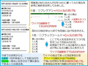 視聴者のMら田さんが9月14日に買ってみた報告くれてまして、その報告から傾向探ってみたのですが、中山6レースだけでなく中山10レースでも逃げ馬を買い目に入れているんですよ。
